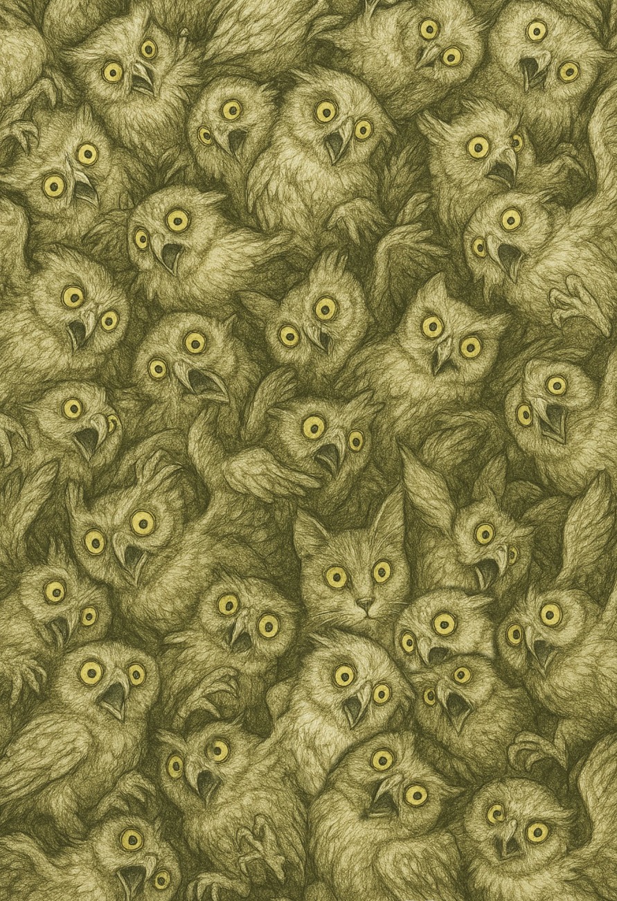 Iš pirmo žvilgsnio ši iliustracija atrodo kaip chaotiškas pelėdų, turinčių plačias, išbaigtas akis, susibūrimas. Jų purios plunksnos ir identiškos išraiškos daro vaizdą perkrautu ir painiu. Tačiau šioje pelėdų jūroje paslėptas visiškai kitoks gyvūnas, ir jį pastebėti nėra taip paprasta, kaip atrodo. Šis sumanus meno kūrinys išbando jūsų gebėjimą pastebėti mažiausias detales tarp gausybės pasikartojimų.