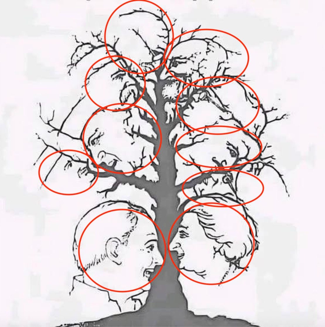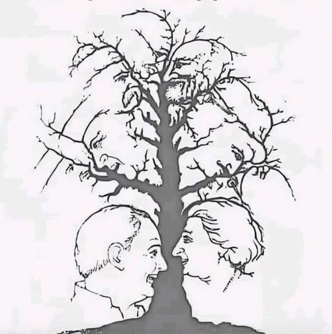 Iš pirmo žvilgsnio šis vaizdas atrodo kaip paprastas medžio su plikomis šakomis piešinys. Bet pažvelgus atidžiau, pastebėsite kažką įdomaus, paslėpto jo dizaino viduje – veidus, kruopščiai įkomponuotus į šakų ir kamieno linijas. Tai, kas iš pradžių atrodo kaip įprastos šakos, greitai atskleidžia sudėtingą optinę iliuziją, parodančią, kaip mūsų protas yra linkęs ieškoti žmogiškų formų netikėtose vietose.