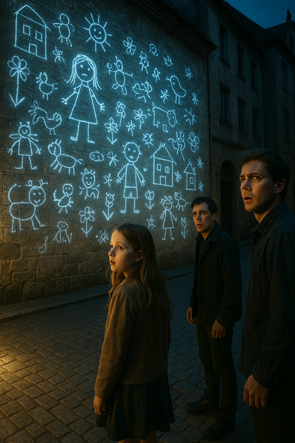 Nuo tada mieste ėmė dėtis keisti dalykai. Naktimis žmonės girdėdavo kreidelių barškėjimą, nors gatvės buvo tuščios. O kai kurių butų tapetuose savaime atsirasdavo linijos, sudarančios vaikų piešinius.