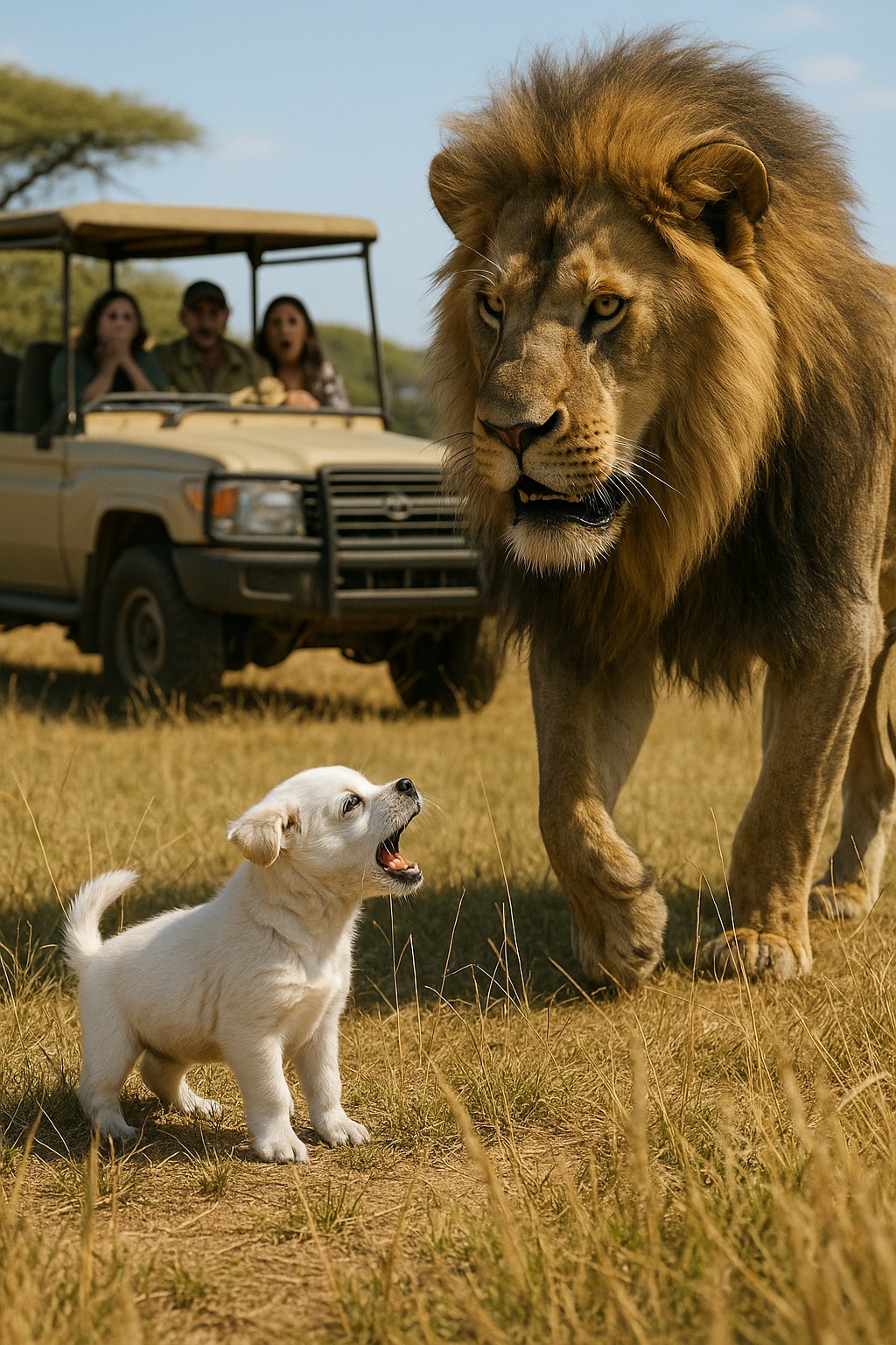 Liūtas žengė keletą žingsnių į priekį. Jo karčiai plazdėjo vėjyje, akys žibėjo, o riaumojimas perskrodė tylą. Visi laukė vieno – kad po sekundės jis užpuls šuniuką.