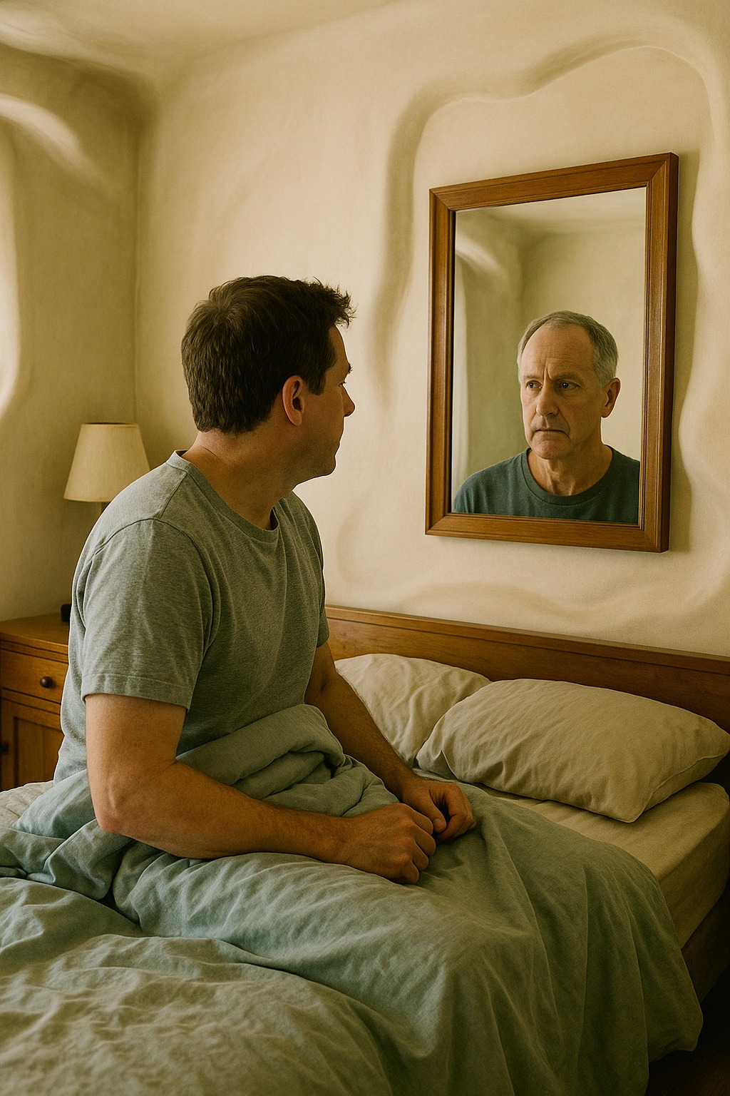 Vieną naktį jis pabudo nuo keisto šnibždesio. Koridoriuje stovėjo kažkas. Figūra buvo miglotai pažįstama… kol jis suprato: tai buvo jis pats. Absoliuti kopija. Dvynys nusišypsojo ir tarė: