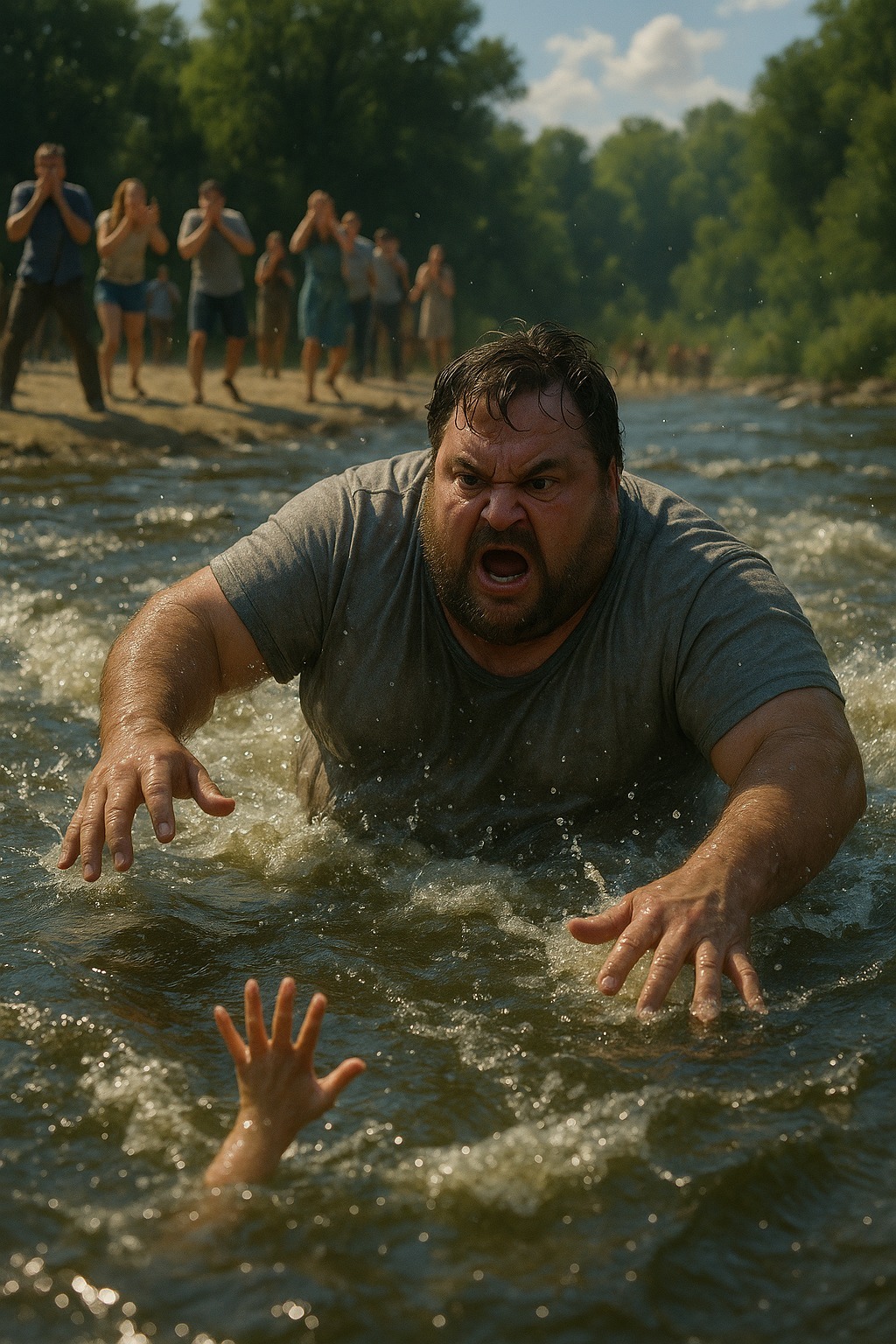Vienas berniukas nukrito nuo uolos tiesiai į upę. Srovė jį paėmė ir sukiojo kaip pagaliuką. Jis vėl sušuko, dusdamas, jo rankos bejėgiškai siekė į viršų.