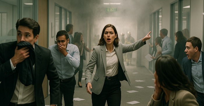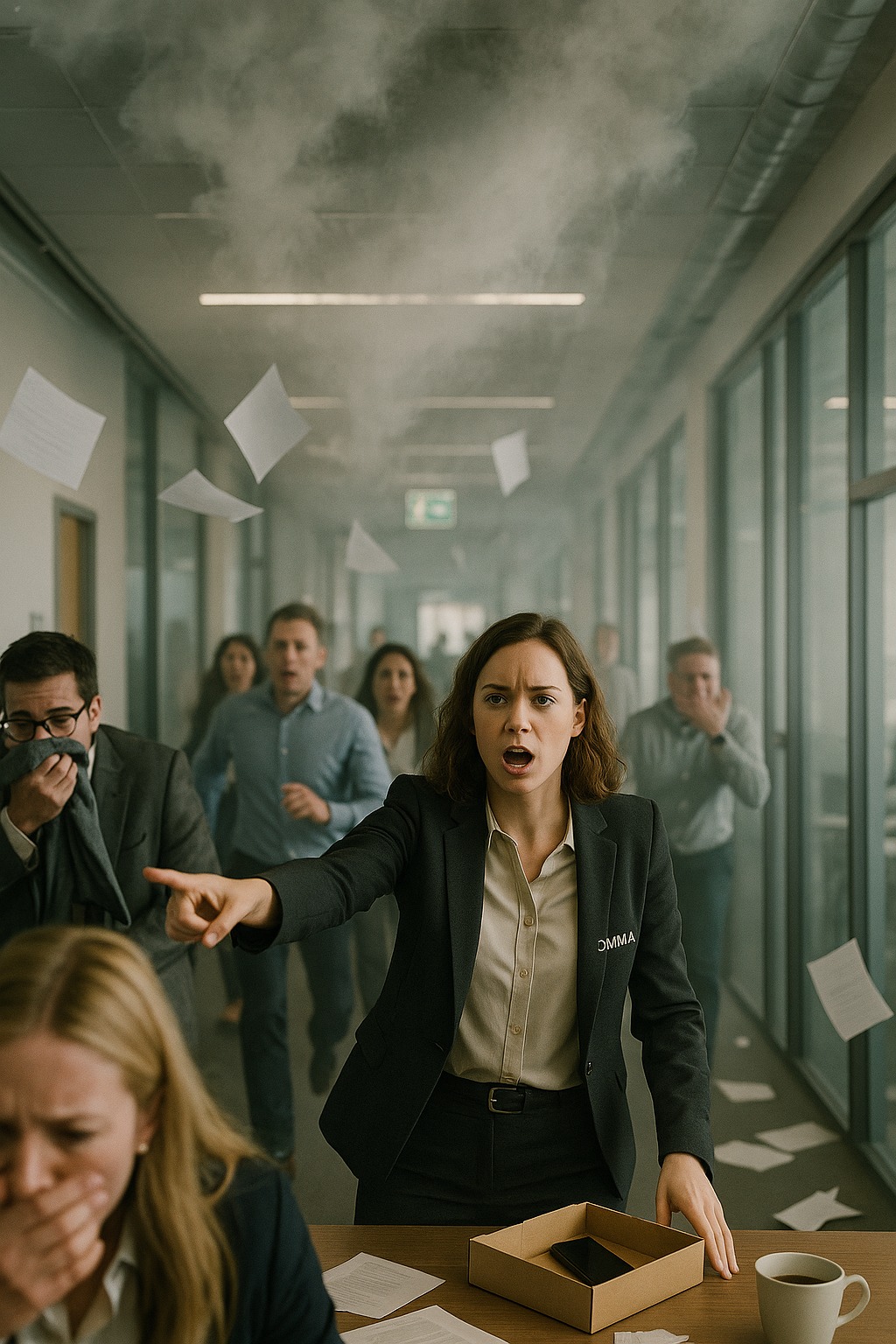 Kolegos sutriko: kažkas griebė rankinę, kažkas sustingo panikoje, nežinodamas, ką daryti. Bet Emma nesuabejojo. Ji garsiai sušuko, kad visi paliktų daiktus ir eitų prie išėjimo. Jos balsas prasiskverbė per triukšmą ir chaosą, priversdamas žmones veikti.
