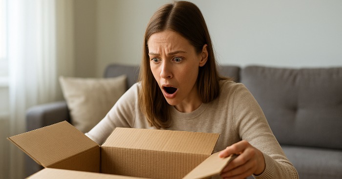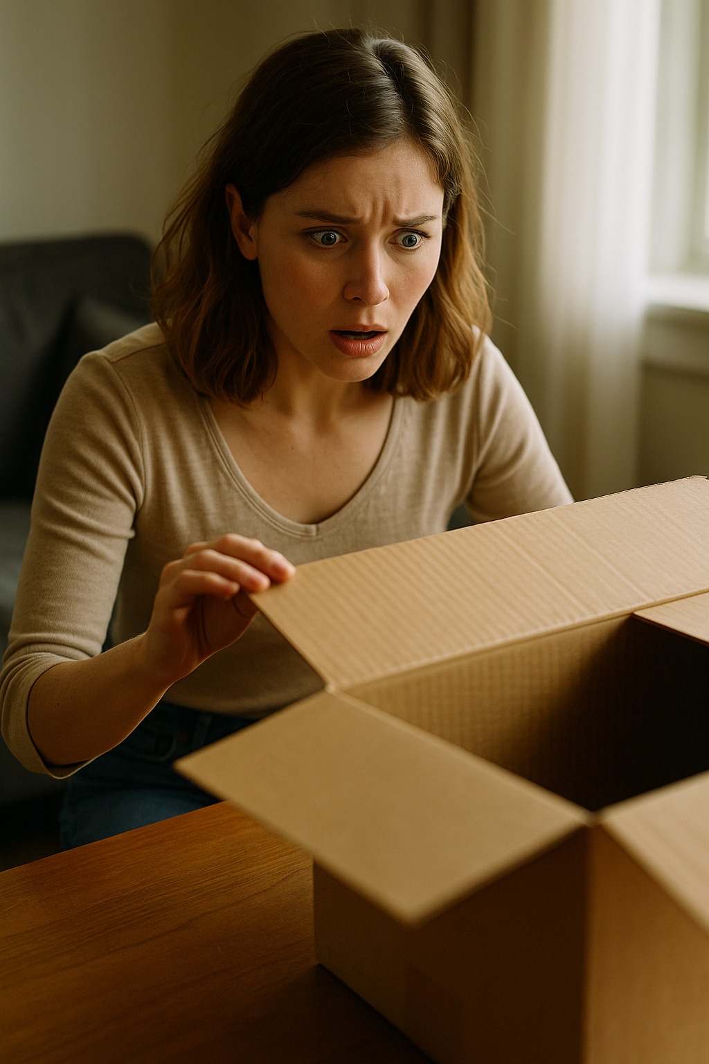 Kai kurjeris atnešė dėžę, ji džiaugsmingai ją atidarė. Tačiau vietoj tvarkingai sulankstyto suknelės viduje buvo keista krūva aplankų ir vokų. Ji sutriko. Viduje nebuvo jokių daiktų. Tik popieriai.