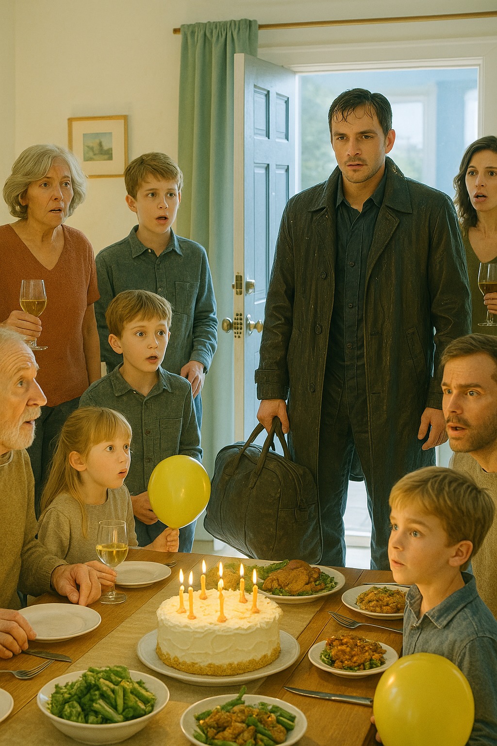 Kai vedėjas paskelbė tostą ir visi pakėlė taures, pasigirdo beldimas į duris. Iš pradžių niekas nekreipė dėmesio, manydami, kad tai kaimynas atėjo pasveikinti. Bet beldimas pasikartojo – atkaklus ir garsus. Šeimininkas atidarė duris, ir slenksčioje pasirodė vyras. Šlapiu paltu, su kelionine krepšiu ir pavargusiu žvilgsniu.