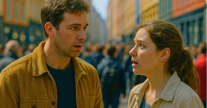 Vyras, aukštas, apsirengęs paltu, rankose laikė aplanką su dokumentais. Jis ėjo greitai, visiškai pasinėręs į savo mintis. Moteris su maišeliu vaisių skubėjo į kitą pusę, ir jų keliai staigiai susikirto.