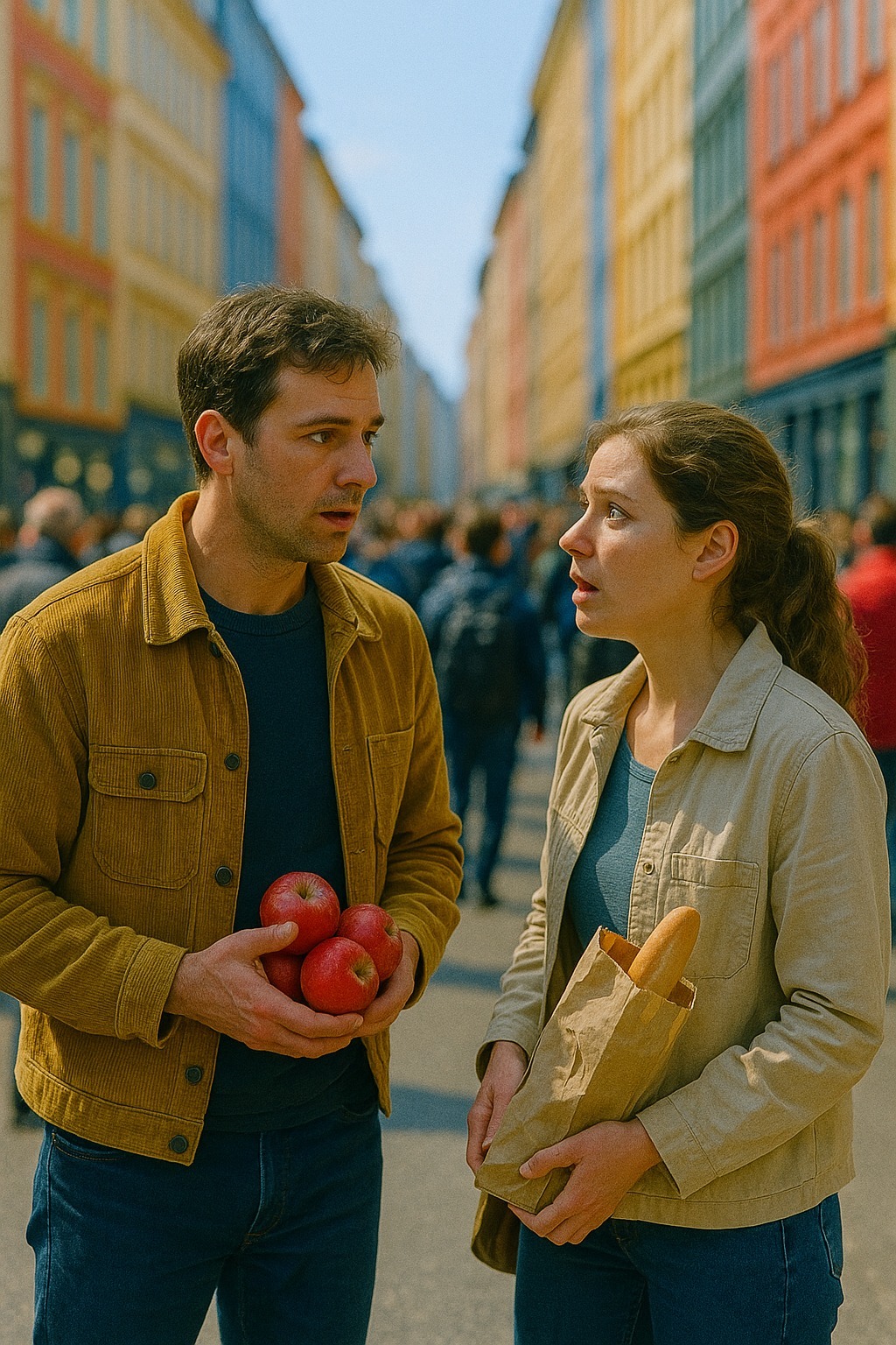 Susidūrimas buvo stiprus – maišas suplyšo, obuoliai išsibarstė po grindinį. Vyras tuoj pat atsiklaupė, padėdamas surinkti vaisius. Jų rankos atsitiktinai susilietė. Atrodytų, smulkmena, bet abiejų širdyse kažkas suvirpėjo.