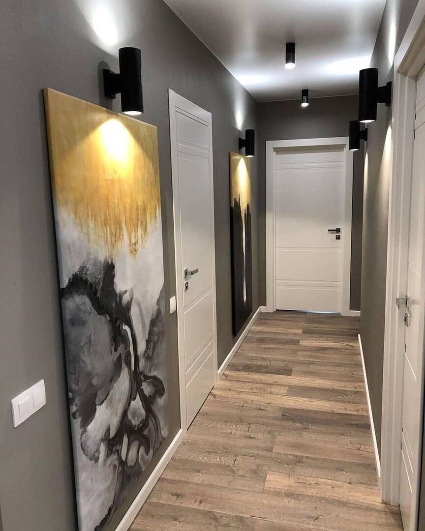 Atmosferą nusprendėme sustiprinti dideliais abstrakčiais paveikslais – juodi potėpiai su auksiniais akcentais atrodo neįtikėtinai įspūdingai. Grindys padengtos vėsia pilka laminato danga, kuri puikiai dera prie bendros spalvų gamos. Duris tarp kambarių palikome klasikinės baltos spalvos, o virtuvės duris pašalinome, sukurdami aiškų praėjimą.