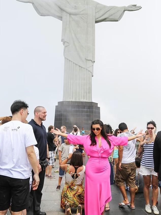 Įžymybė priminė gerbėjams, kad anksčiau lankėsi šiame paminkle, pasidalindama nuotrauka, daryta prieš dešimt metų, kai lankėsi Rio de Žaneire su Kanye Westu. Anuomet ji taip pat pasirinko aptemptą rožinę suknelę.