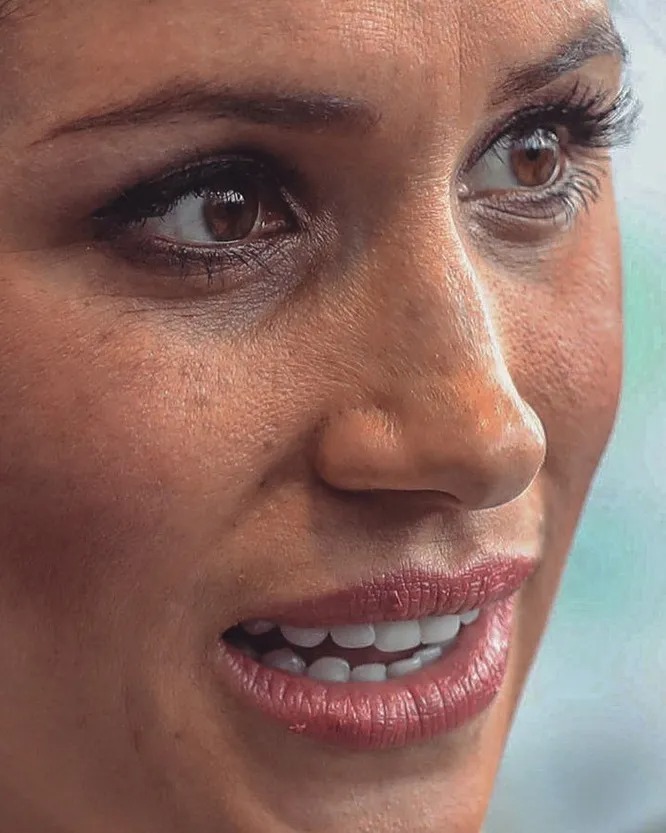 Vertiname Meghan už jos sąžiningumą prieš kamerą: ji neslepia strazdanų, nepersistengia su sunkiais makiažo pagrindais ir nesiekia tobulos kaukės. Makrofotografijoje matomos subtilios raukšlelės ir odos tekstūra. Vienintelis jos trūkumas – sausos lūpos, dėl kurių lūpų dažai tepasi netolygiai.