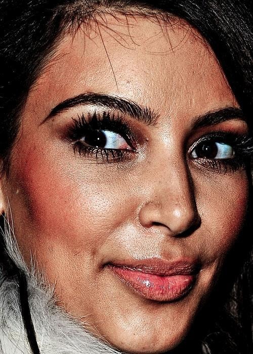 Kim retai rodoma be filtrų, ir ne be reikalo. Daugiapakopis kontūravimas ir storas matinis pagrindas puikiai atrodo fotoaparate, tačiau iš arti jie atskleidžia odos tekstūrą: poras, raukšles ir sausas vietas. Be to, Kim mėgsta retušavimą – net ir be jo jos įvaizdis atrodo visiškai kitaip.