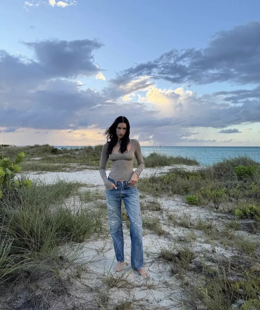 Vėliau fotosesija tęsėsi nuošaliame paplūdimyje. Irina nuotraukoje pasirodė su baltu rankšluosčiu ant galvos – paprasta detalė, kuri gražiai kontrastavo su jos auksiniu įdegiu. Kartu su vandenynu ir apleistu krantu nuotraukos įgavo beveik kinematografinį atspalvį.