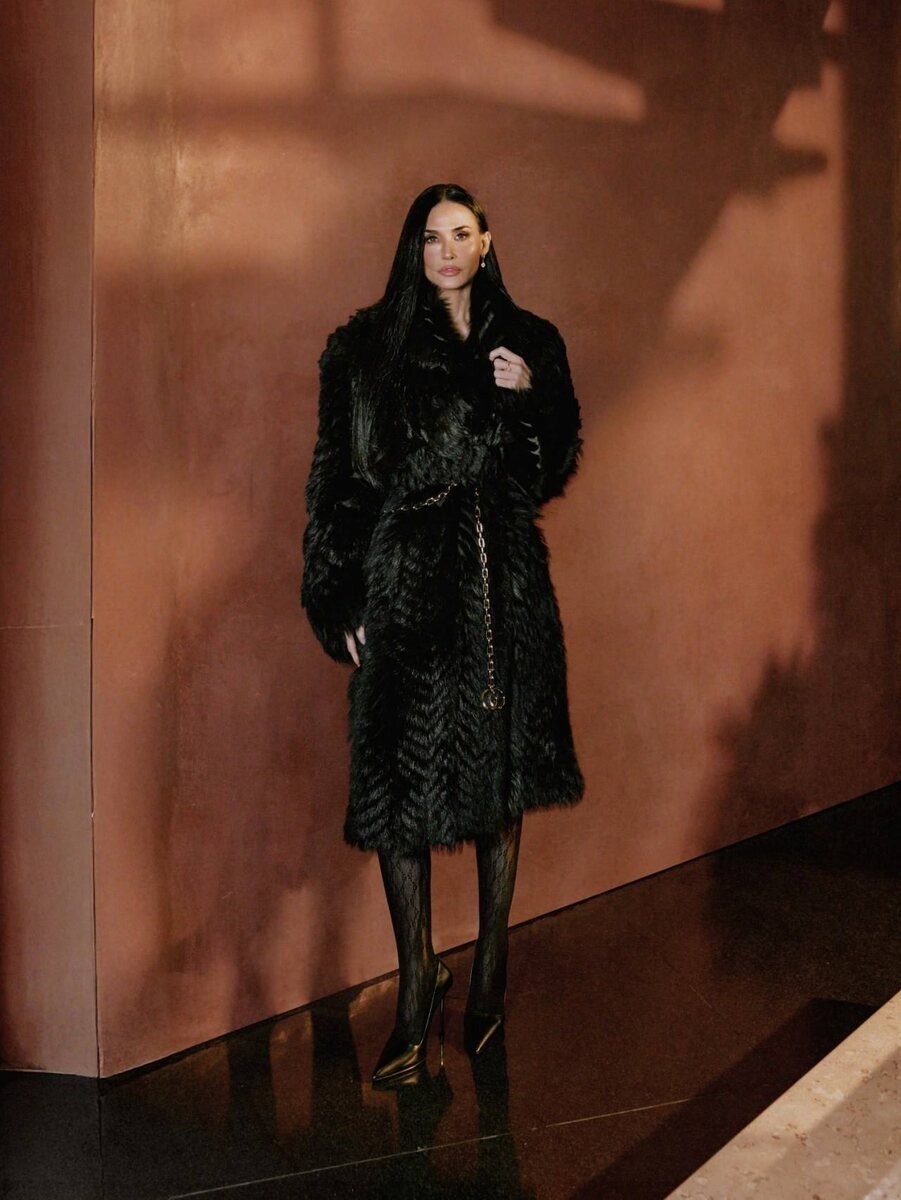 Nuotraukose Moore pasirodo dviem pilnais Demnos debiutinės kolekcijos „La Famiglia“ įvaizdžiais. Drabužiai jos nedėvi – jie seka paskui ją. Švarios linijos, kontroliuojamas dramatizmas ir santūrumo jausmas, kuris atrodo labiau tyčinis nei atsargus. Jos judėjime kadre yra kažkas dūminio, tarsi pats oras aplink ją sulėtėtų. Audinys priglunda arti, beveik klausosi, gaudo šviesą taip, kaip žemas balsas patraukia dėmesį.