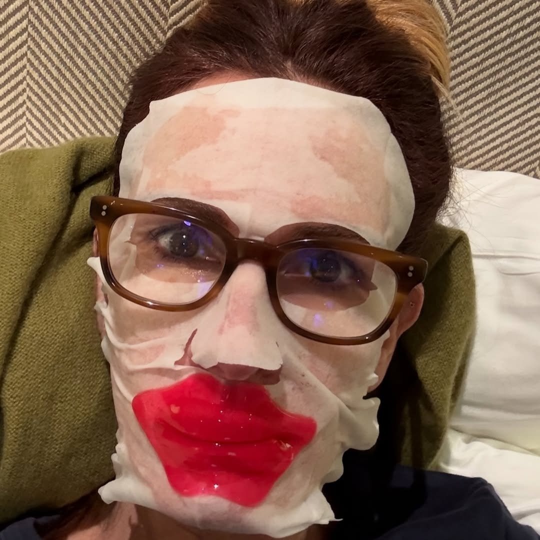 Tada ateina ta dalis, kuri privertė žmones šypsotis. Julia veidą dengia lakštinė kaukė, ji taip pat nešioja lūpų dažus – tokius odos priežiūros priedus, kurie bet ką priverčia atrodyti šiek tiek juokingai pačiu atpažįstamiausiu būdu. Tai ne „kino žvaigždės“ žavesys. Tai praktiškas „Aš tai darau, nes tai veikia“.