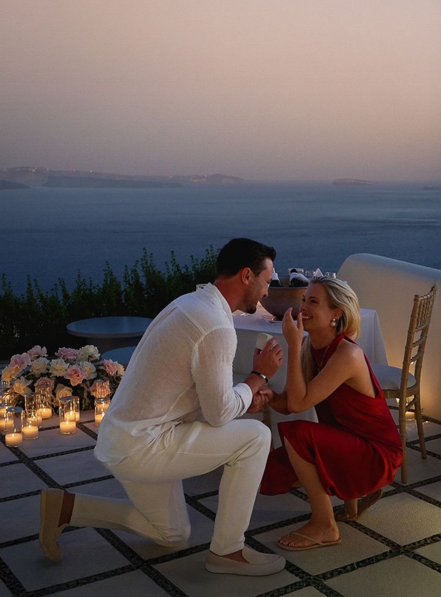 Pačios sužadėtuvės įvyko anksčiau vasarą Santorinyje, po devynerių metų kartu. Žiedas buvo labai asmeniškas. Jį sukūrė pats Millerdas: 2,5 karato kriaušės formos deimantas, gautas Pietų Afrikoje, šalyje, kurioje abu užaugo. Jokios pasiskolintos simbolikos, jokio pertekliaus – tiesiog bendra istorija, sutalpinta į vieną objektą.