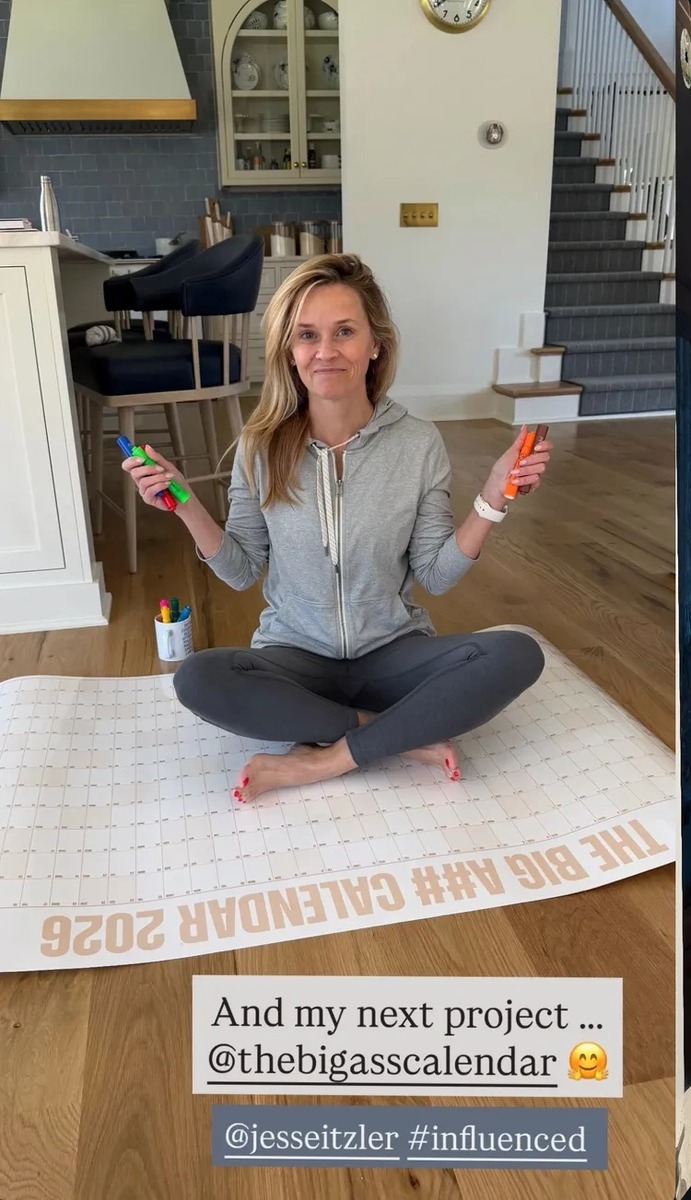 Netikėčiausia detalė slypi tiesiai po ja. Witherspoon tiesiogine prasme sėdi ant milžiniško popierinio kalendoriaus – per didelio, šiek tiek chaotiško ir neįmanoma ignoruoti. Tai labiau primena prisipažinimą, o ne rekvizitą. Gyvenimas, darbas, terminai – visa tai išdėstyta blokais, o ji sėdi tiesiai ant jų.