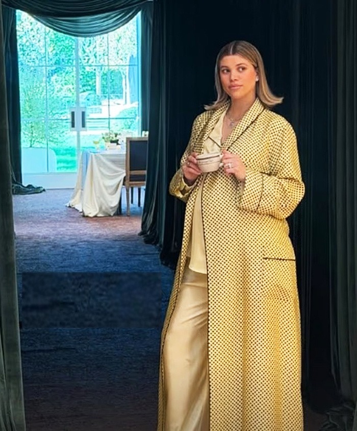 Sofia pasirinko pieno spalvos atlasinį komplektą, prie kurio derėjo auksinis chalatas su grafiniu raštu ir rudais apvadais. Jos makiažas buvo švelnus ir tinkamas dienai, o bob šukuosena buvo perskirta per vidurį ir švelniai susukta, pabrėžiant lengvą, elegantišką įvaizdį.