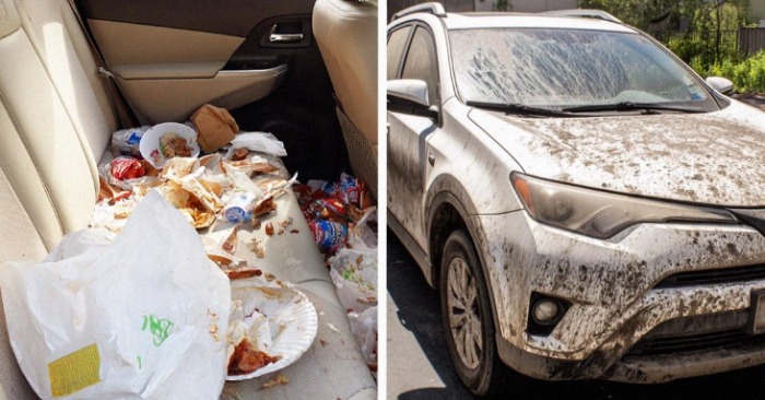 Visur purvas. Įbrėžimai šone. Viduje trupiniai, riebalų dėmės, lipnūs puodelių laikikliai, greito maisto pakuotės, smarvė.