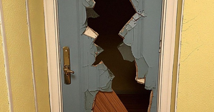 Ne tik atidaryta – sudaužyta. Vyriai kabojo kreivai, rėmas suskilęs į šipulius.