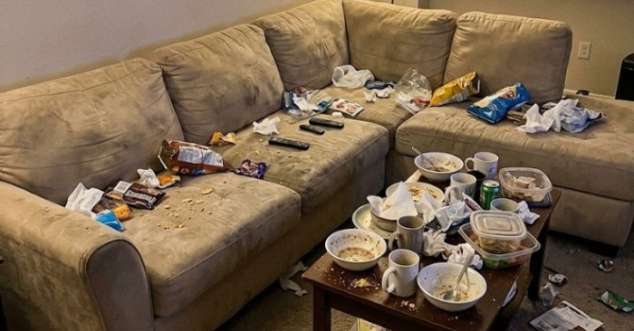 Darbo paviršiai buvo nukloti šiukšlėmis: popierinėmis lėkštėmis, picos plutele, riebaluotomis servetėlėmis, pusiau tuščiais apelsinų gazuoto gėrimo buteliais. Žinoma, niekas nebuvo sudėta į šiukšlių maišus. Niekas net neapsimetė norintis susitvarkyti.
