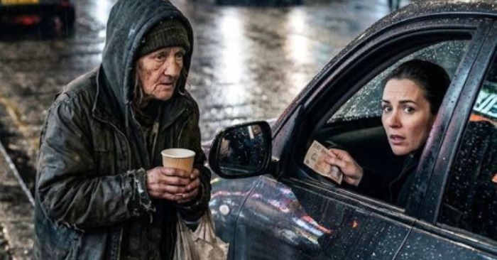 Turėjau sustoti prie šviesoforo ir išsiblaškęs žvelgiau pro langą. Prie mano automobilio priėjo vyresnio amžiaus moteris, apsigaubusi sena, permirkusia striuke, kurios gobtuvas buvo žemai užtrauktas ant veido. Rankoje ji laikė popierinį puodelį, kuriame tyliai žvangėjo kelios monetos.
