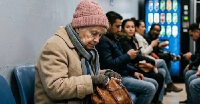 Pagyvenusi moteris sėdėjo ant paties šalto plastikinio suoliuko krašto, tvirtai laikydama seną rudą krepšį. Jos paltas buvo per plonas tokiam orui, šalikas nudėvėtas, o batai atrodė taip, lyg jau būtų atlaikę daug atšiaurių žiemų. Ji vos pakėlė galvą, tik retkarčiais atsargiai žvilgtelėdama į savo krepšį, tarsi tikrindama, ar ten dar yra kas nors svarbaus.