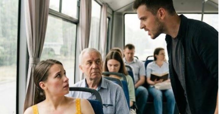 Jaunai porai įlipus į autobusą, įtampa buvo juntama. Moteris viena ranka įsikibo į stulpą, kita – į pilvą; jos akys buvo paraudusios nuo verksmo, o judesiai – netvirti, tarsi ji vos pastovėtų ant kojų. Vyras ėjo arti jos, nepalikdamas jai jokios erdvės, o jo balse jau girdėjosi pyktis.